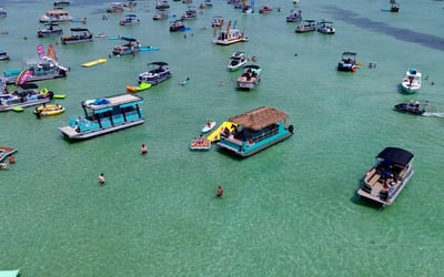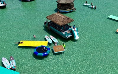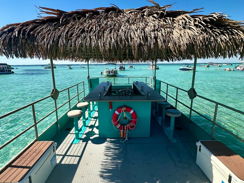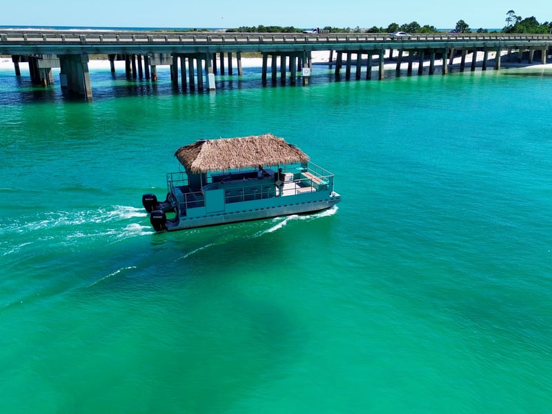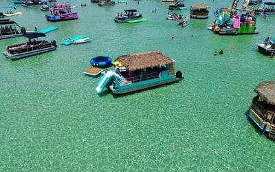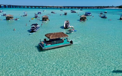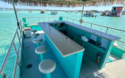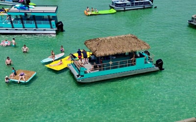 Spend the day at Crab Island on a private tiki pontoon with a licensed captain and crew. Depart from Destin Harbor and enjoy floats, toys, and shaded seating for a relaxed day on the water.