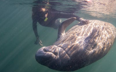 Enjoy a private, heated boat tour to swim with manatees with gear included