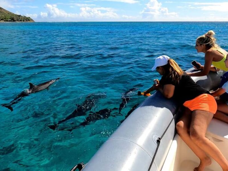 Captain Chris and his crew have created something pretty special here. This isn't your typical crowded tour boat experience. These are private charters on a speedboat, which means you get to customize your day and zip around to spots the bigger vessels can't access. The vibe is relaxed and fun, with good music playing while you cruise the coastline. People consistently rave about how knowledgeable and personable Chris is, and his crew members (Sara, Sarah, and Josh get shoutouts) seem equally great at making guests feel comfortable and entertained. The marine life sightings are genuinely impressive. Multiple groups encountered spinner dolphins, humpback whales, sea turtles, and tons of fish while snorkeling. Chris apparently has a knack for finding wildlife and will happily follow pods of dolphins or whales for extended periods. One reviewer even mentioned the crew stopping to pick up trash from the ocean, which is a nice touch. There's also a unique tiki sunset cruise option that takes you to La Mariana, a vintage tiki bar only accessible by boat, which sounds like an absolute blast based on the glowing descriptions. One honest three-star review does offer a different perspective worth noting. That family felt the captain was distant and hard to connect with, and they were taken to a choppy snorkeling spot off Waikiki Beach despite rough conditions, leading to seasickness and poor visibility. They felt it wasn't worth the premium price tag. However, this seems to be the exception. The overwhelming majority describe warm, personalized service and a willingness to adapt to what guests want to see, whether that's dolphins, whales, or just cruising with good vibes.