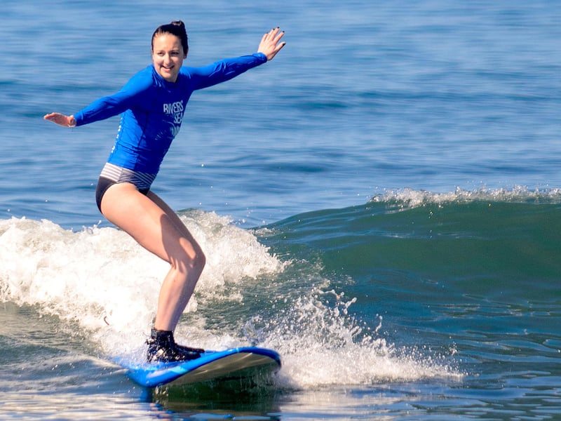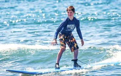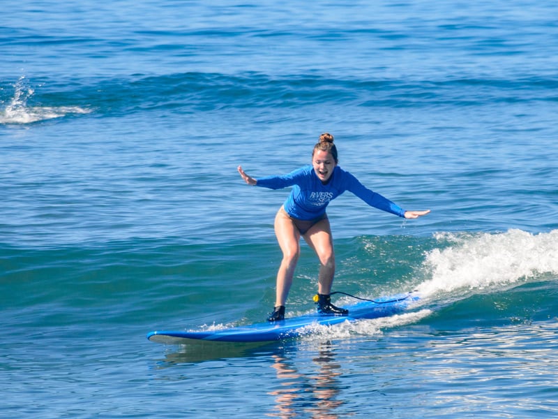 Ages 7 and up only. Students use soft-top boards; fiberglass rentals may be available for experienced surfers for an additional fee.