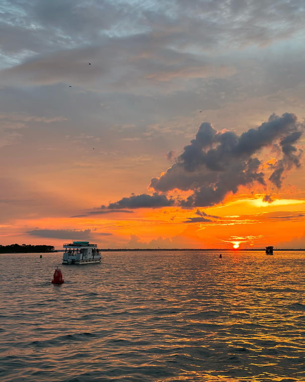 Enjoy a private 1.5-hour sunset cruise on Choctawhatchee Bay with chances to see dolphins and views of Destin Harbor's evening lights. Capture the glow as the sun sets while you relax aboard a comfortable luxury boat.