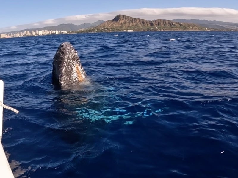 Spot humpbacks on a private Waikiki catamaran with optional snorkel time