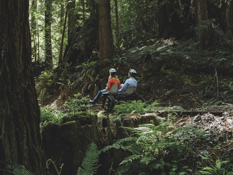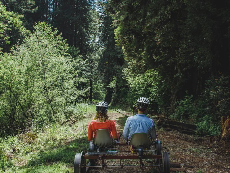 Pedal an electric-assist railbike through redwood groves and along Pudding Creek with a guide.