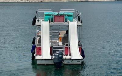 Celebrate on a double-decker party boat with captain, slides, and room for 18