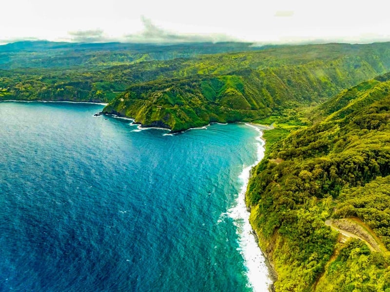 Combine a 45–50 minute helicopter flight with a private guided Road to Hāna tour. See rainforest cliffs, waterfalls, and a black sand beach.