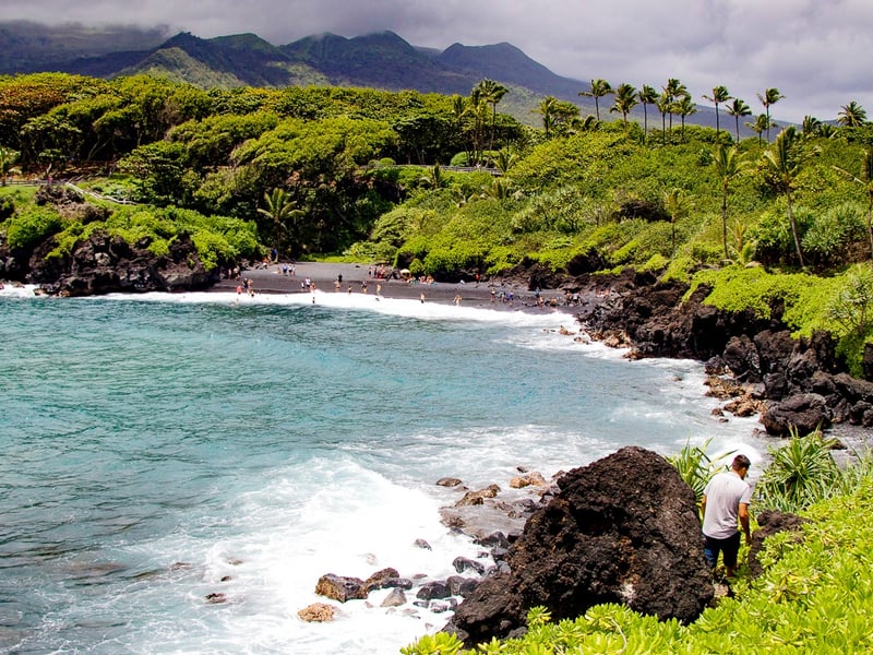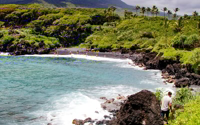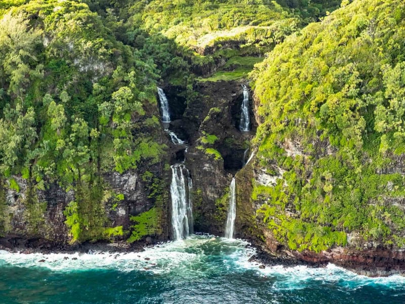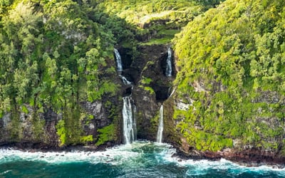 Experience a helicopter flight and private Hana tour to see waterfalls, rainforest, and a black sand beach