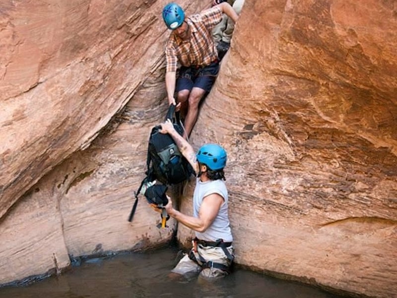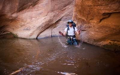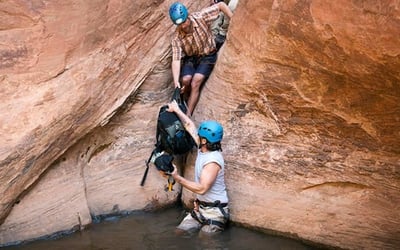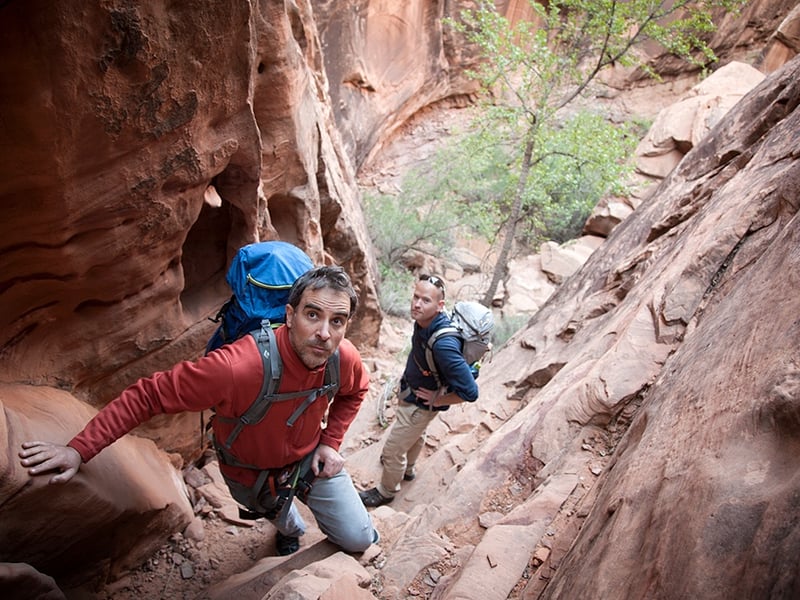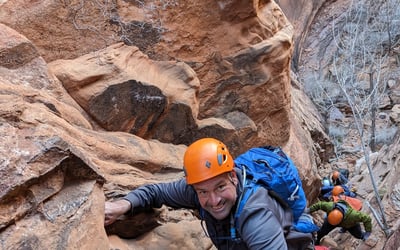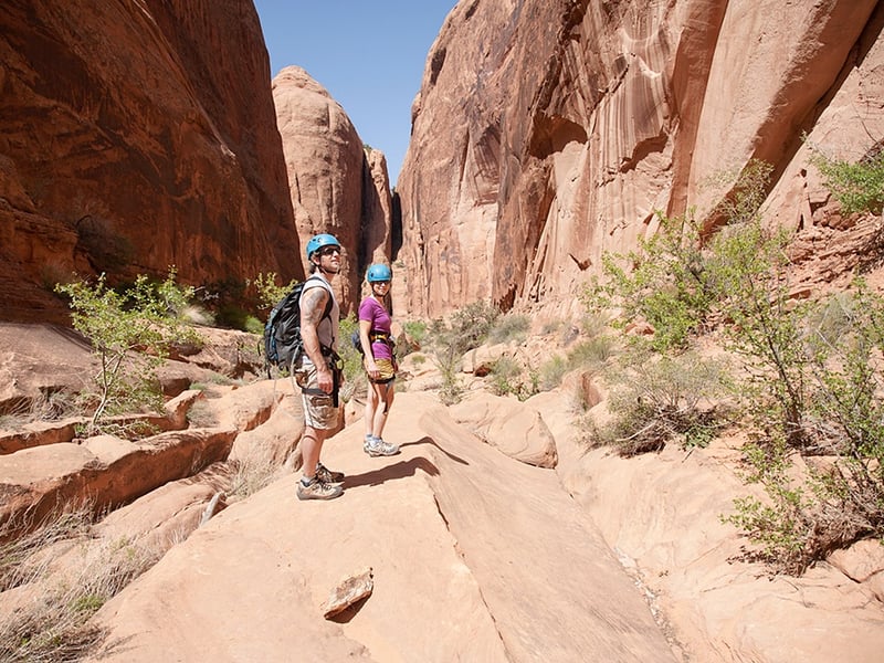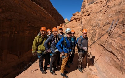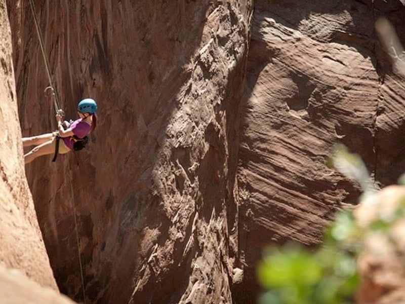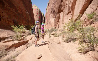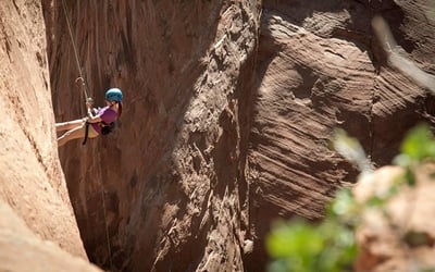 Tackle a challenging slot canyon with three rappels, arches, and rock art
