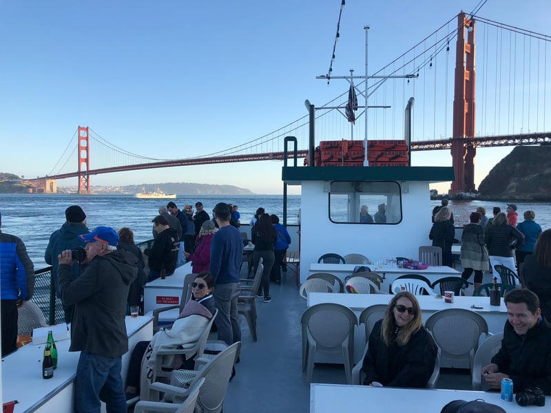 This review is specifically for the Wildlife Tour of the Bay Area, and not for the general ferry service that goes to Angel Island. This tour takes place on the Tamalpais vessel, not the general ferry. First of all, believe what you read about nearby parking being somewhat of a challenge in Tiburon, but within a five minute walk to the ferry terminal there are plenty of lots. I suggest parking across from Woodland Market, and behind Bank of America, and pay for three hours ($2.50 an hour). Give yourself some extra time to walk a few blocks to the terminal. Also, mind your speed in Tiburon, and remember street parking is only two hours. Tiburon's police department is well funded and very well staffed. The vessel Tamalpais, which is the wildlife tour vessel, does not have a topside observation deck, so ignore what people have advised about "getting in line early" to get the best spot topside. They are talking about the general ferry service. There really is no need at all to worry about getting a good seat or a good view on the Tam. Just head inside until they leave the dock, (so you are not in the crew's way on the narrow passages along the railing) then wander outside and find a spot along the rail to watch the scenery. Stand on the bow or port (left) side for sunny city views on the way out of Tiburon. You can gather along the rails upstairs or on the main deck all the way around the ship. If you want to sit, you're pretty much going to be inside. Standing aft (back) is the roughest ride, but the view is great. The exhaust is vented underwater, so it's not as bad aft as it can be on the ferries. They do serve alcohol and other beverages, but no food except bags of chips. If you are hungry you can grab something from Woodland's deli. Or just eat before you get to Tiburon. It's only a 90 minute excursion. The village of Tiburon has lots of posh little eateries and shops, if that's your scene. As far as the tour goes, it's a fairly straightforward run under and past the Golden Gate Bridge, where you'll hang out for a few minutes, then right back to Tiburon. You might see some whales or porpoises, you might not. You will see great views of both sides of and underneath the bridge, a great SF skyline view, and distant Alcatraz views. You will not go near Alcatraz or Angel Island, so don't be mislead just because Angel Island is in the company name. Overall, it's a fun boat ride and the vessel is well run and well maintained. It's worth the extra money and scheduling restrictions because you do go out beyond the golden gate. Other than that, honestly, if you want to get put onto the bay easily, you can just take any of the ferries around the bay for far less money and more flexibility in terms of the schedule. The difference is the crew will announce if they see wildlife, and will slow down to let passengers watch the scene. It's on a schedule but not so destination-oriented as a ferry. It was a fun time just being on the water and would be something I'd do again when playing tour director to out of town guests.