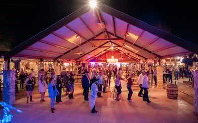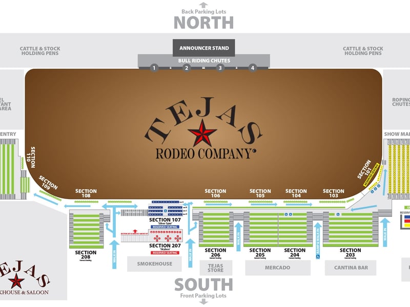 Runs March–November. General Admission seating is first-come; arrive early if you want to sit together. The venue is outdoors with covered arena, stands, dance floor, and dining areas.