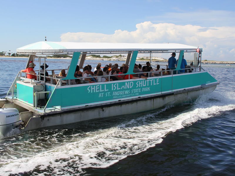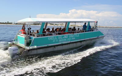 Ride a quick, scenic shuttle to Shell Island and get dropped in a calm cove near the jetty, a short walk from the Gulf. Stay and explore until the last boat back.