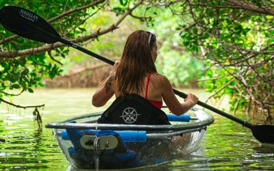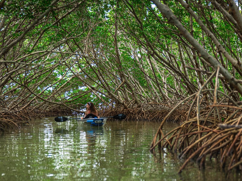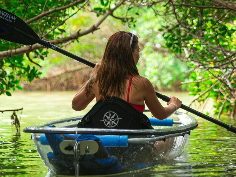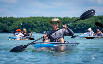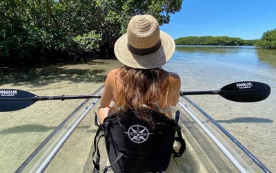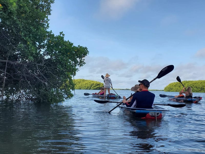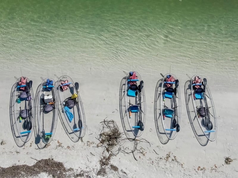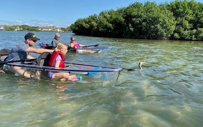 Paddle crystal-clear Tampa Bay waters in see-through kayaks to explore mangroves, beaches, and vibrant marine life.