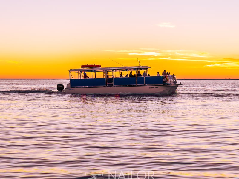 Watch playful dolphins and a vibrant Gulf sunset while enjoying complimentary beer and wine.