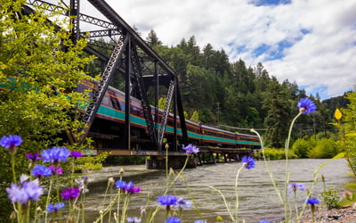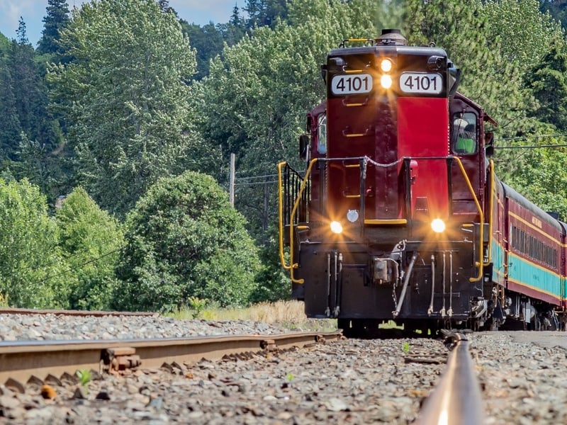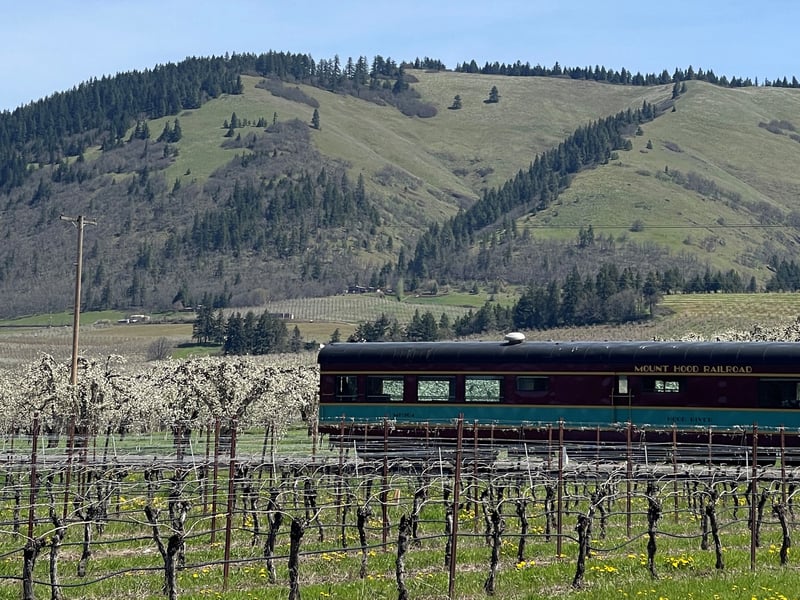 Ride a scenic heritage railway through spring blossoms with peekaboo views of Mt. Hood