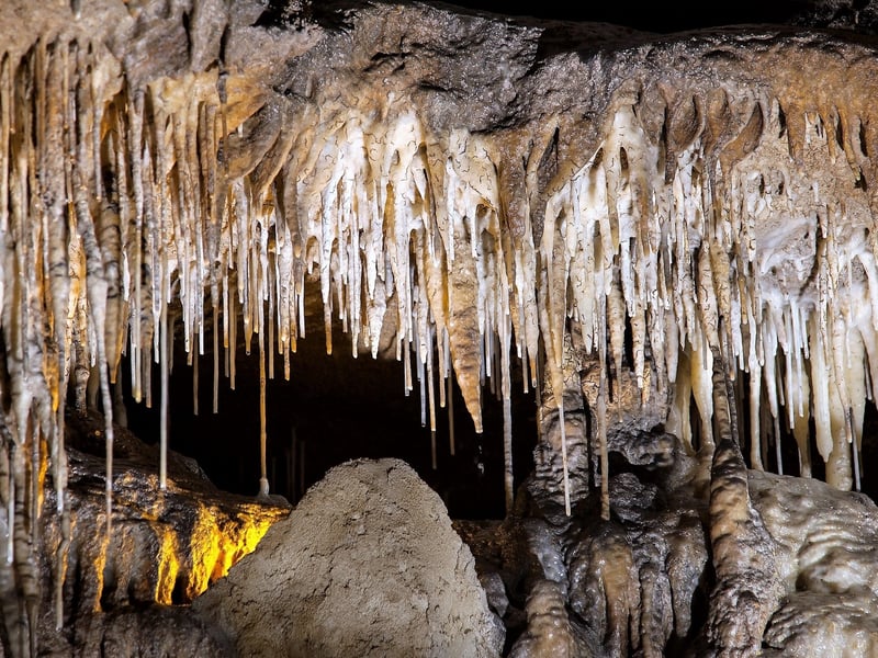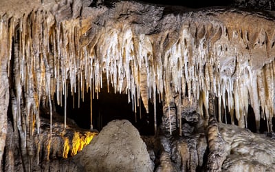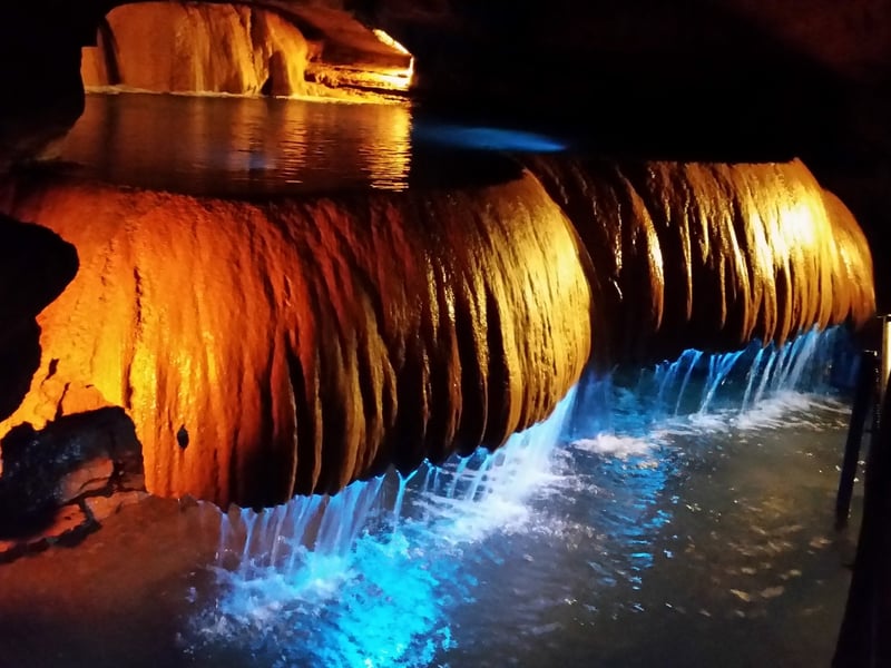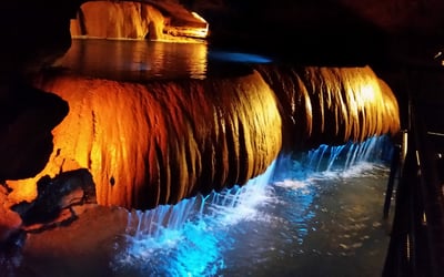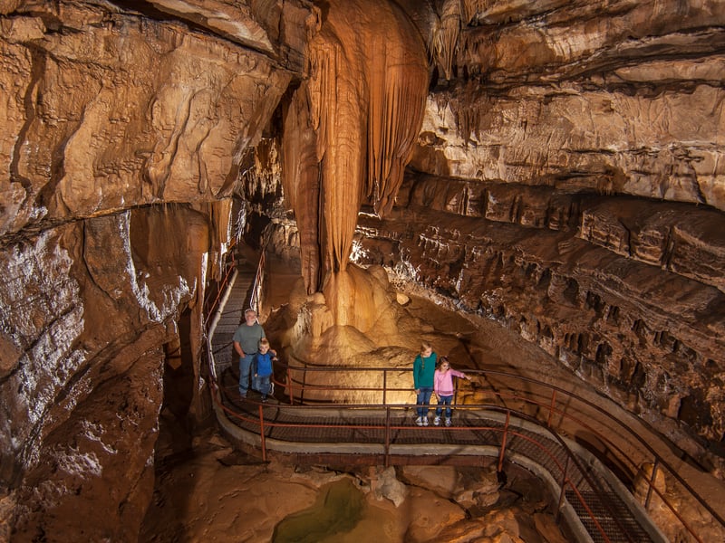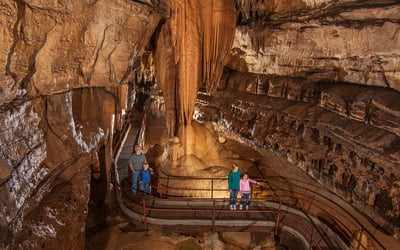 Explore a living cave with rushing streams, underground waterfalls, and striking formations. Walk about 1/3 mile on lighted, paved paths and steel bridges as you learn how the caverns formed.
