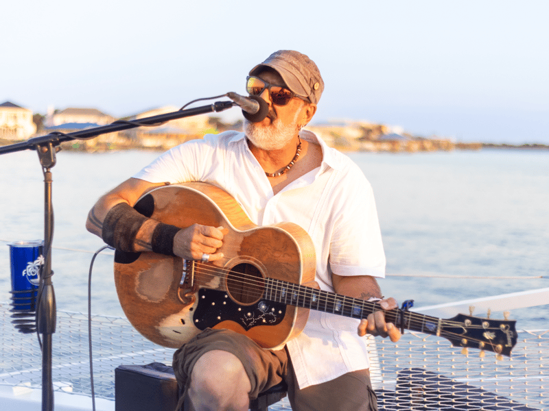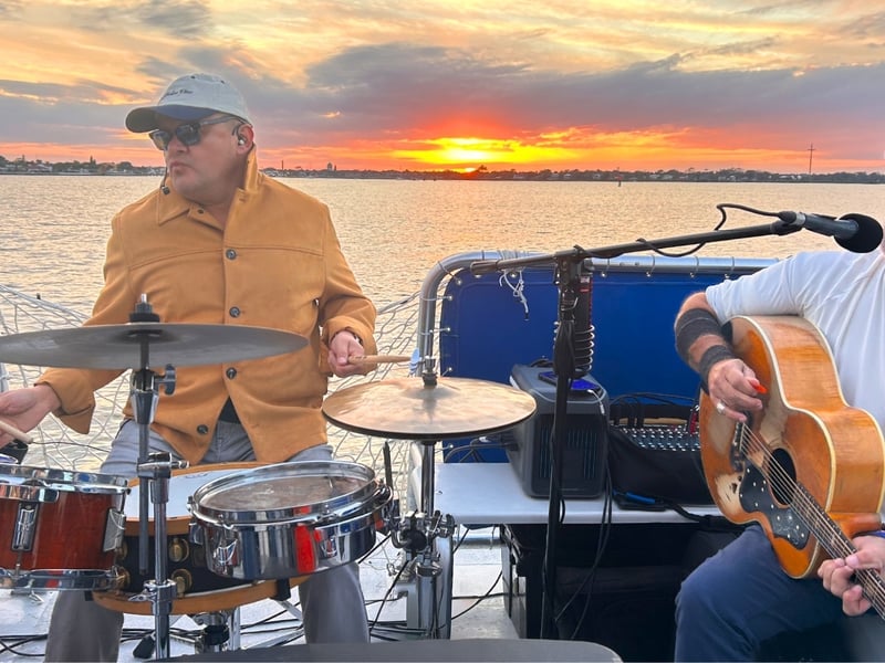Enjoy sunset views with live music, drinks, and snacks aboard a spacious catamaran