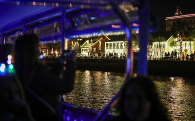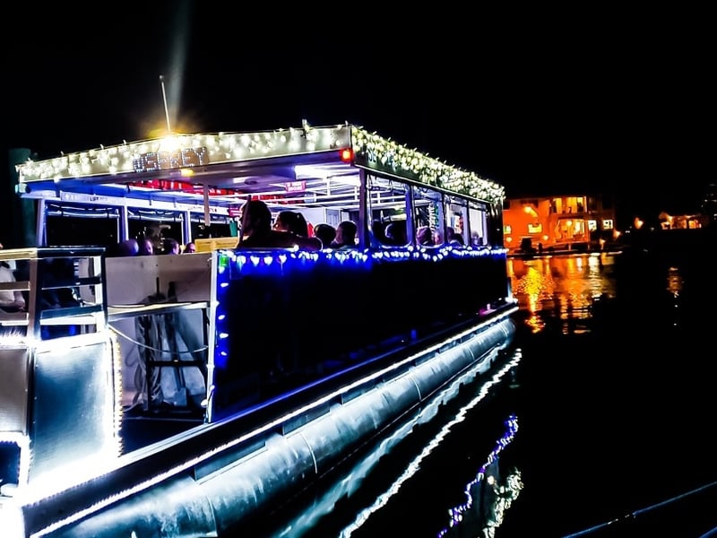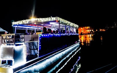 Admire holiday lights from an enclosed boat with bar, cocoa, 3D glasses and live narration.