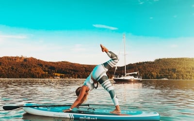 Flow through Vinyasa poses atop a paddleboard while soaking in tranquil lake views.