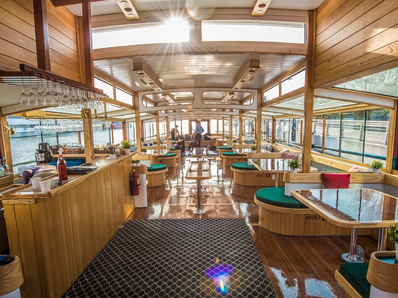 Check in 15–30 minutes early; boarding begins 5 minutes before departure and the yacht leaves on time. No outside alcoholic beverages allowed; food is not included but light fare is available for purchase. Operates rain or shine; cabins are heated in winter and air‑conditioned in summer.