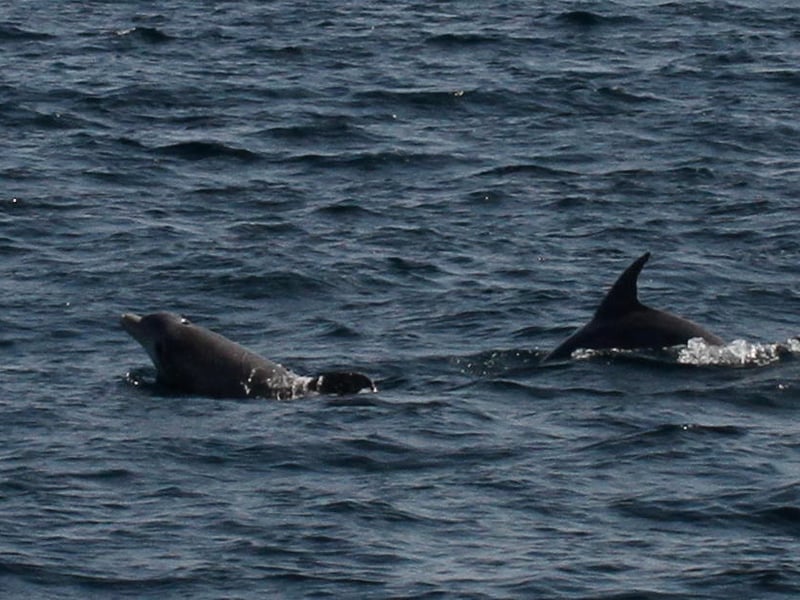 Often dolphins and local birds; the crew may haul a net with sea life.