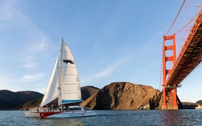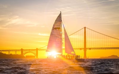 Glide past Alcatraz and beneath the Golden Gate Bridge as the city skyline glows in the setting sun.