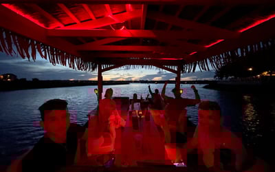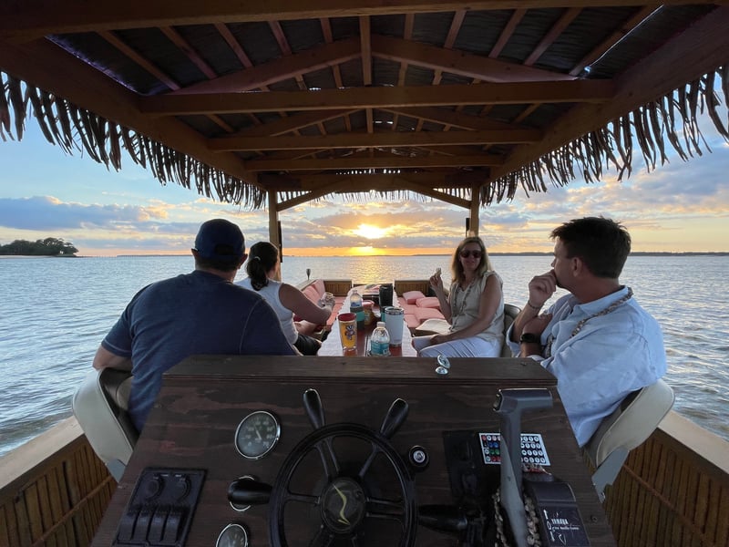 Cruise at sunset with island music and a tiki bar on a small boat for up to 6