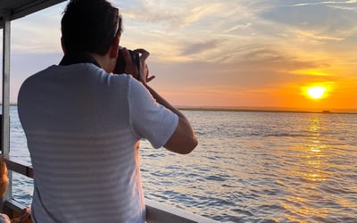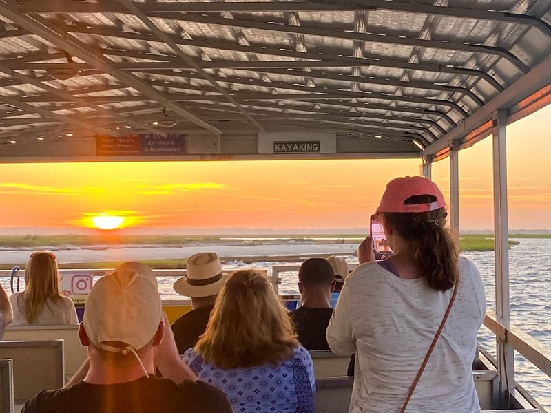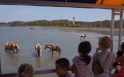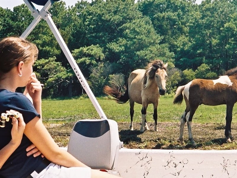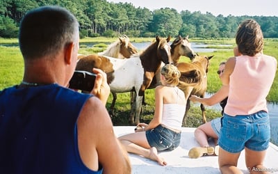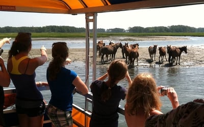 Spot wild ponies, dolphins, and birds as you relax on calm waters at sunset