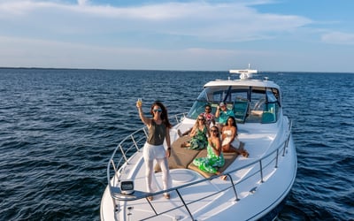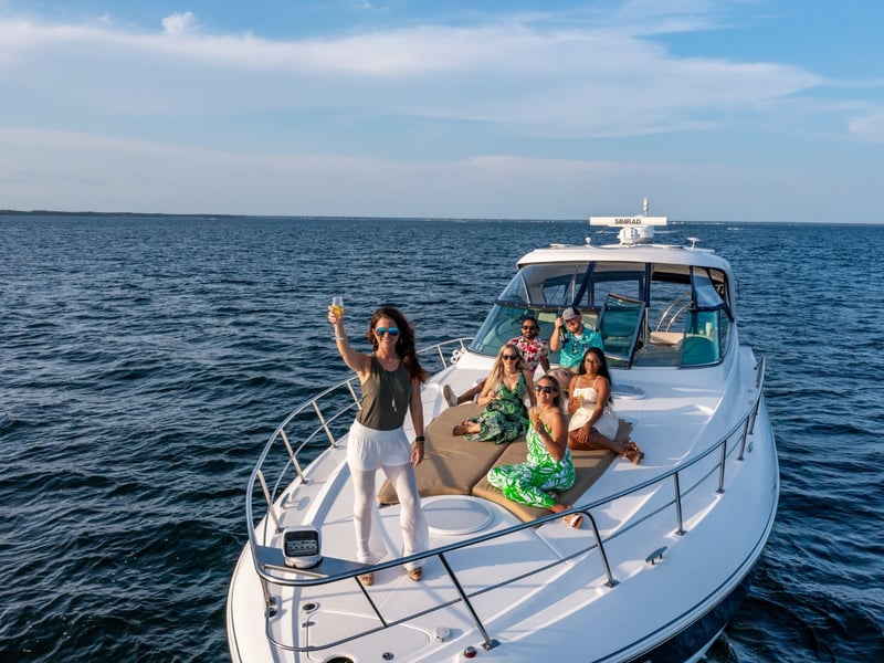 A $125/Hr USCG captain and crew fee is due upon boarding the vessel. All participants must be 21 or older. Please do not bring red wine, dark fruit juices, or red carbonated beverages on board. Wear sandals or boat shoes; avoid slick soles and black soles.