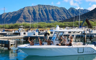 Head offshore along West Oahu's Waianae coast to respectfully swim with wild bottlenose and spotted dolphins. Cruise in a comfortable ROBALO R272 with cushioned seating and a small group for an intimate encounter.