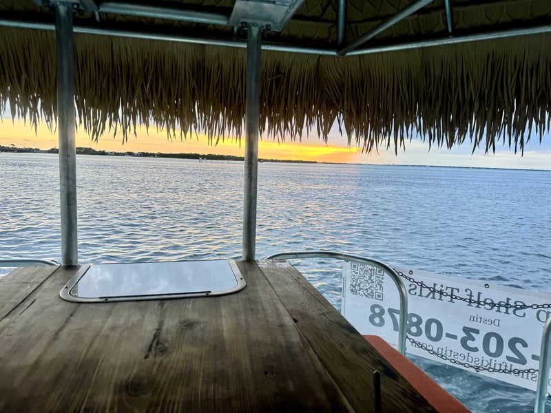 Unwind on a captained tiki boat with restroom and bottled water as the sun sets