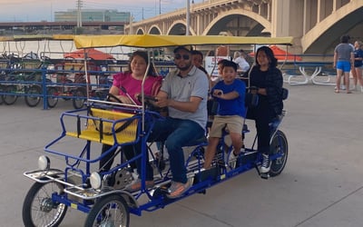 Enjoy a fun group ride with up to 6 adults and 2 children on a triple surrey bike.