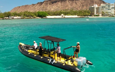 Cruise the Waikiki coastline to Turtle Canyon aboard a 28 ft high-speed zodiac. Snorkel with sea turtles and tropical fish in a small group of six or fewer.
