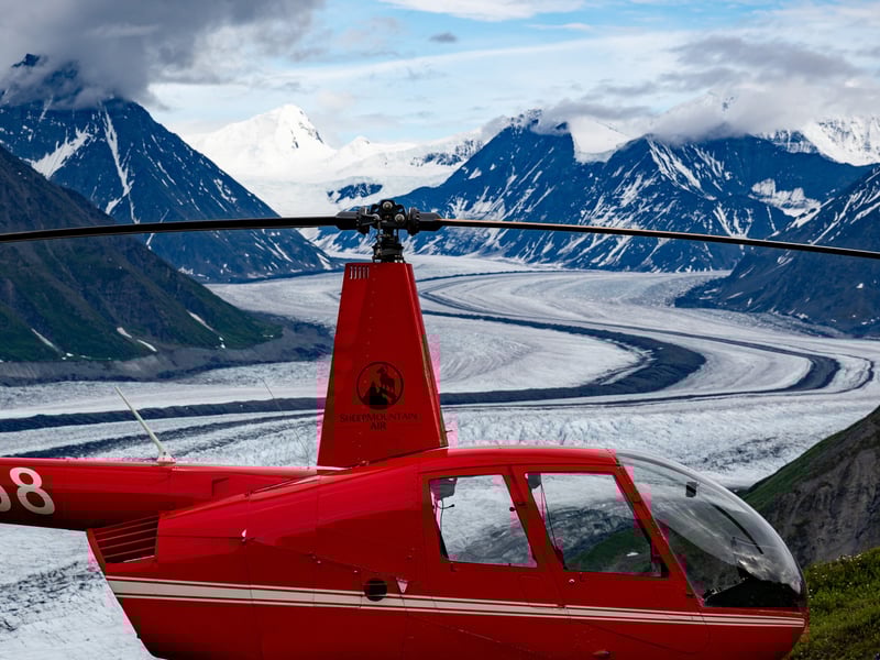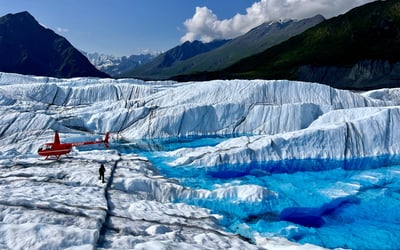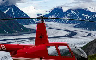 Soar over the Matanuska Glacier on a private helicopter tour with two landings. Choose your second landing on the glacier or a nearby mountain ridge for sweeping views.
