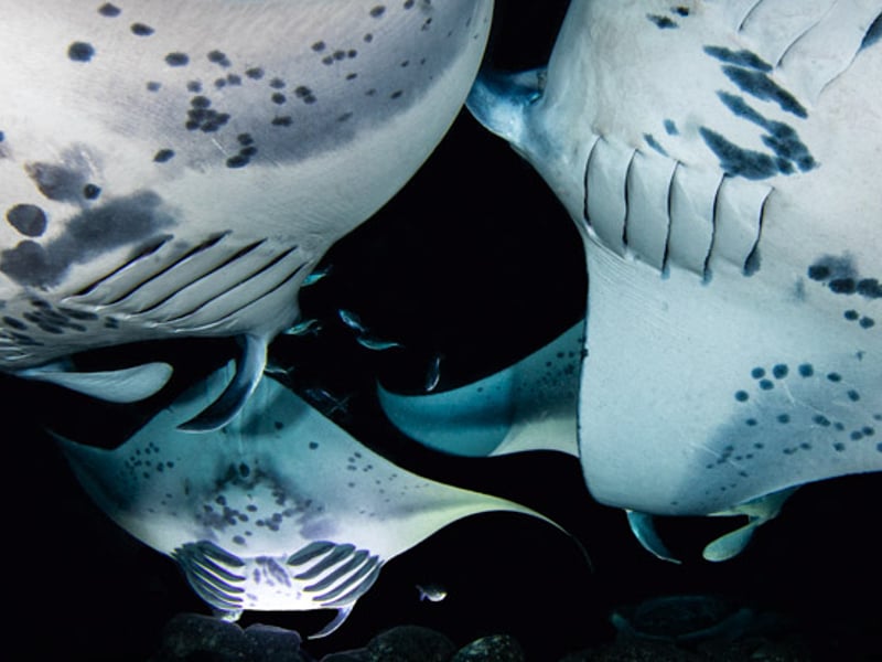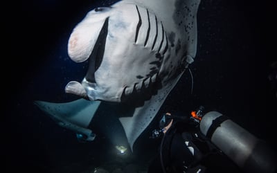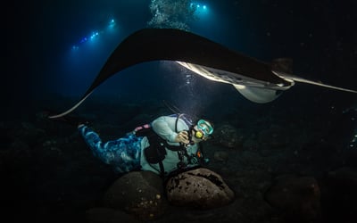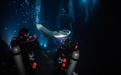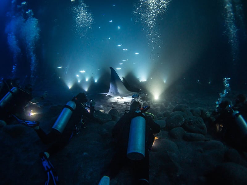 Explore Kona's vibrant reef at dusk and encounter majestic manta rays after dark on one unforgettable dive charter