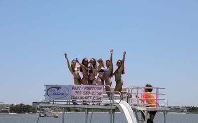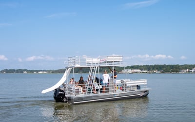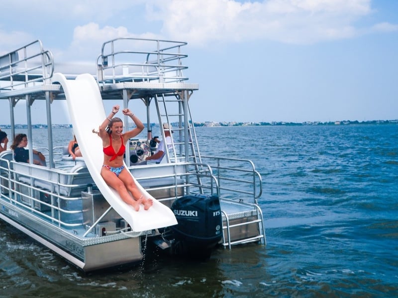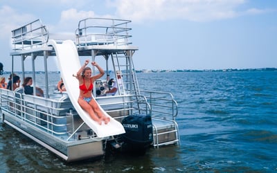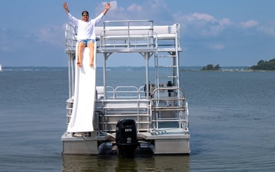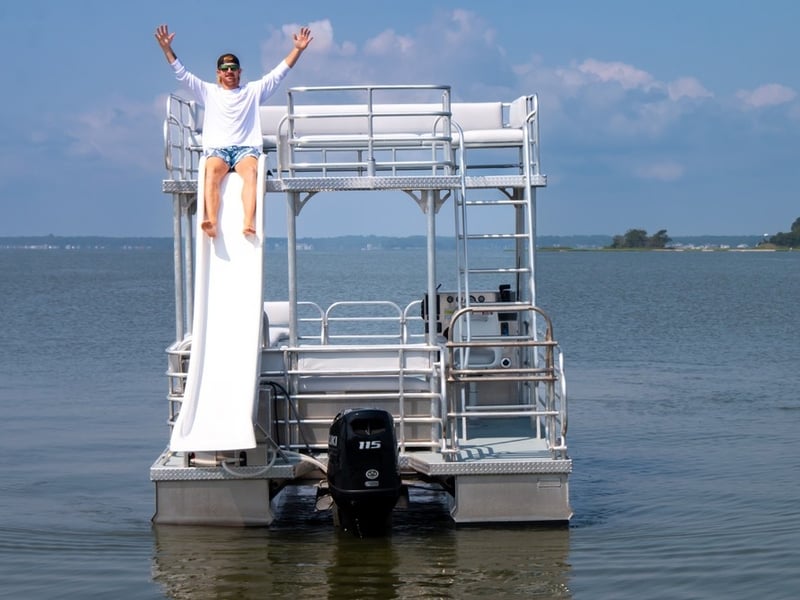 Captain your own double-decker pontoon with a top-deck slide for your group