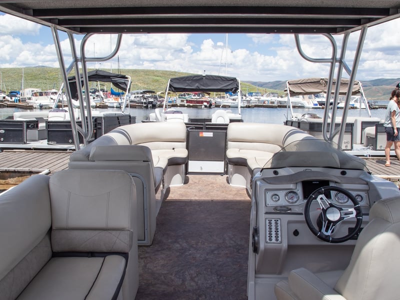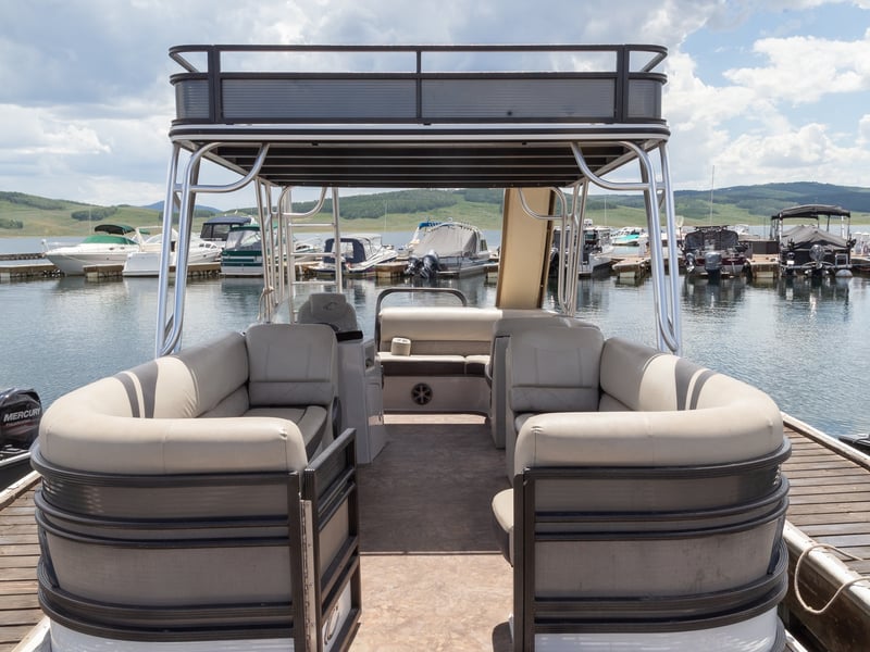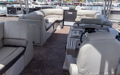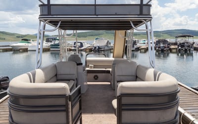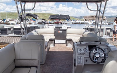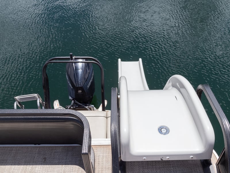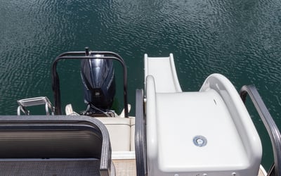Experience a versatile pontoon boat equipped with an upper-level water slide, perfect for family outings and water sports. Enjoy fishing, swimming, or relaxing on the water with included life jackets for all passengers.