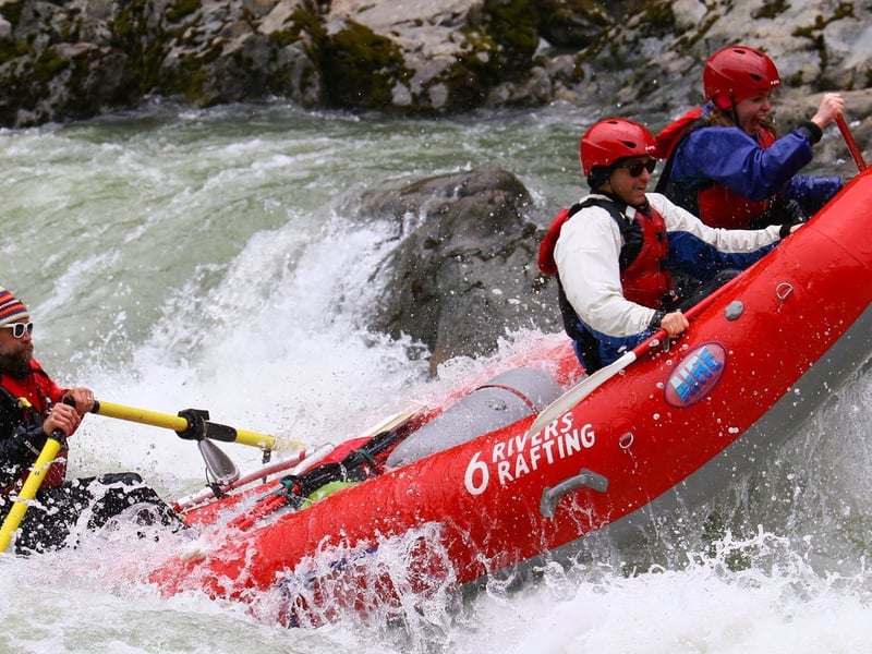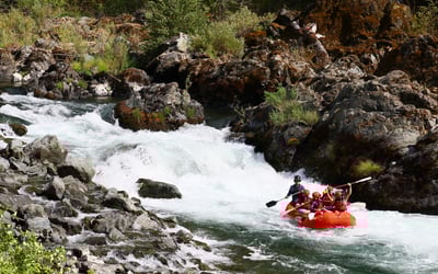 Raft the Pigeon Point section of the Trinity River on a full-day Class III adventure. Enjoy swim stops, a short waterfall hike, cliff jumps, and scenery between splashy rapids; action photos are often available for purchase.