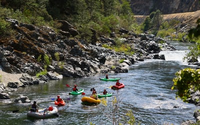 Minimum age is 7; no prior experience needed. Wear strap-on sandals or tennis shoes—flip flops not allowed. Inflatable kayaks available on request; pets welcome.