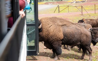 Go behind the scenes to meet animal ambassadors and ride the safari bus with bison feeding and wolf training views