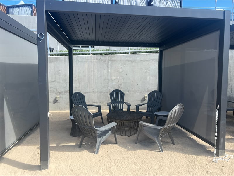 Cabana assignments are made at check-in. No outside food or beverage; reusable water bottles only. Balloons, streamers, confetti, glitter, and dogs are not allowed on the waterfront sand.