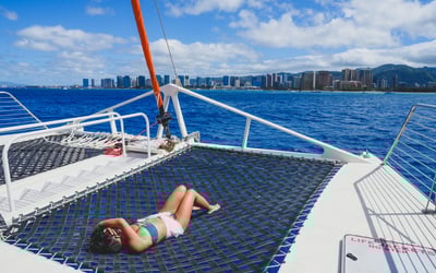 Hawaii Nautical runs an exceptionally well-regarded operation, and it shows in every detail. The crew consistently earns enthusiastic praise for being warm, funny, and genuinely attentive—names like Captain Joey, Chris, Natalie, Kelsey, and Ronnie come up repeatedly as standouts who create a fun, welcoming atmosphere. The snorkeling at Turtle Canyon delivers with excellent visibility, abundant sea turtles, and tropical fish, while the sunset cruises offer stunning views along the Waikiki coastline. Families especially appreciate how accommodating the crew is with little ones, and multiple reviewers call this the highlight of their entire Oahu trip. The catamaran provides a smooth, comfortable ride with complimentary drinks (including beer, wine, and cocktails) that guests love. One minor note: the food is serviceable but basic—think wraps or simple cold sandwiches rather than a proper meal, so arrive well-fed if you're hungry. That said, guests are overwhelmingly happy with the value, describing the experience as worth every penny. The crew's local knowledge, humor, and genuine care for making each trip memorable really sets this company apart from competitors.