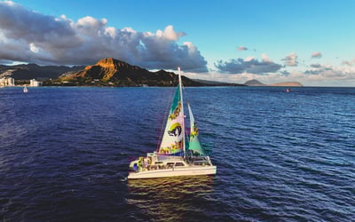 Sail at sunset along the Waikiki coastline and enjoy front-row views of the Friday-night fireworks. Sip drinks from the premium bar and savor an island-inspired bento as city lights and Diamond Head frame the night.