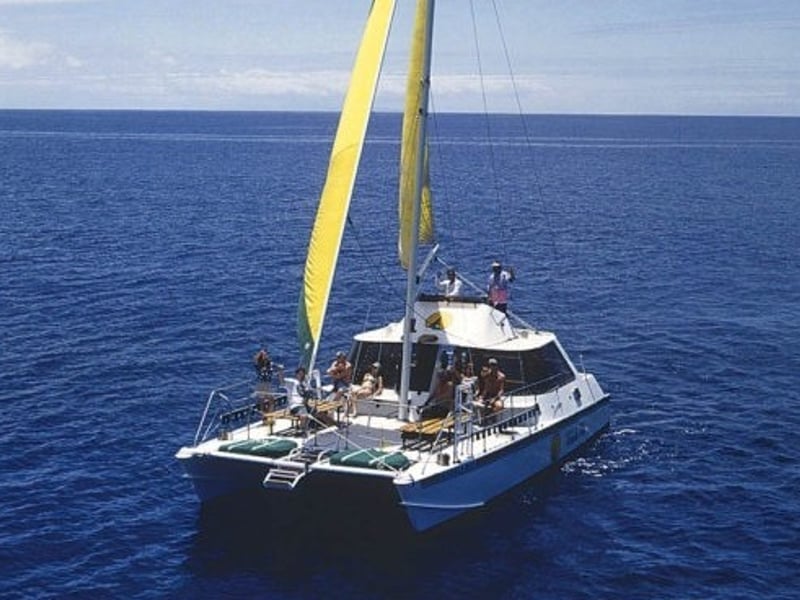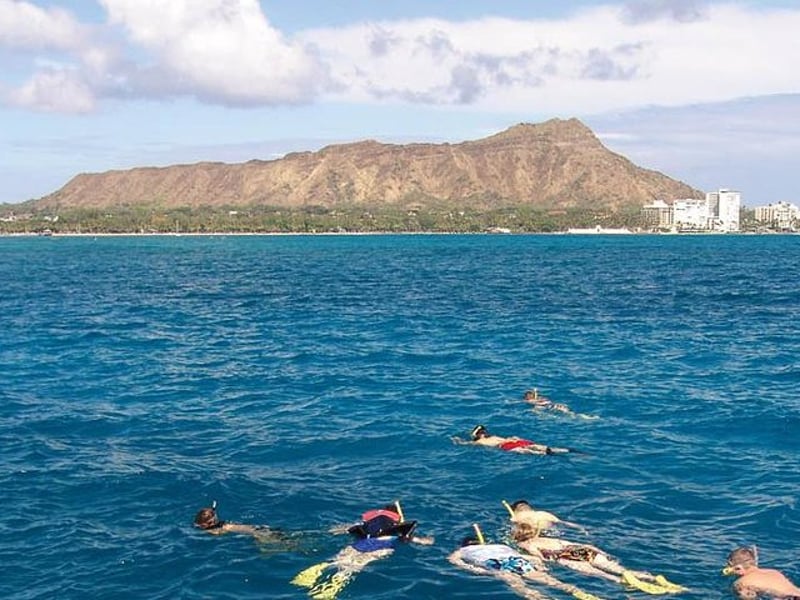 Sail a catamaran off Diamond Head and snorkel with tropical marine life