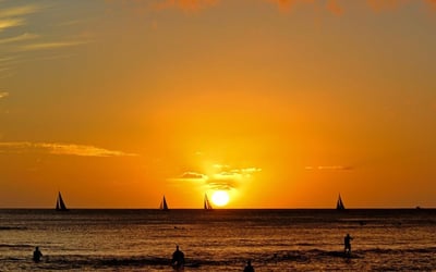 Sail the Waikiki coastline as day turns to night and the sky fills with island colors. Cruise aboard a 55 ft sailing catamaran with inside seating, bow trampolines, and a bar serving mixed drinks and canned beverages. Swimming is optional.
