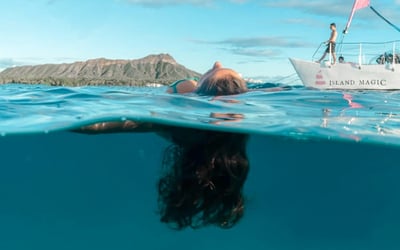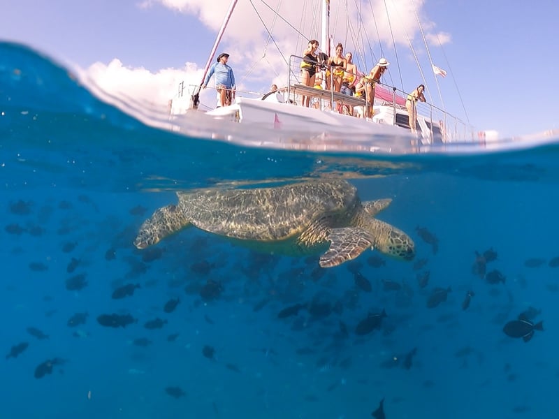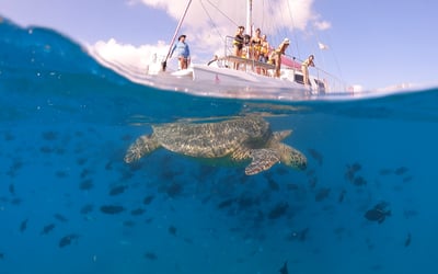 Snorkel with Hawaiian green sea turtles at Turtle Canyon and cruise Waikiki aboard a comfortable catamaran