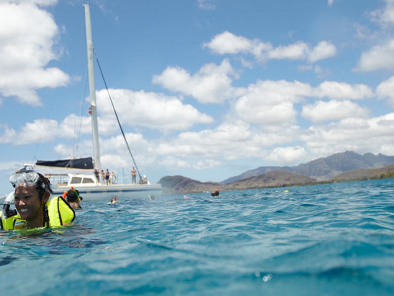 Sail the Waikīkī coastline on a spacious catamaran and snorkel vibrant reef sites. Enjoy crew guidance, comfortable amenities, and island views.
