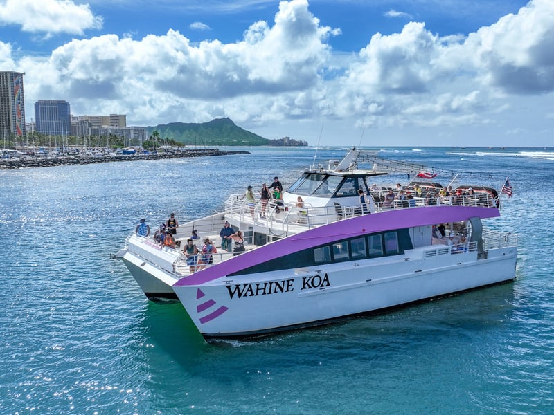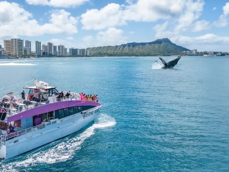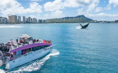 Head out from Waikiki aboard a 65ft power catamaran to watch for humpback whales during their winter migration. Relax with inside and outside seating while you enjoy light snacks and ocean views.