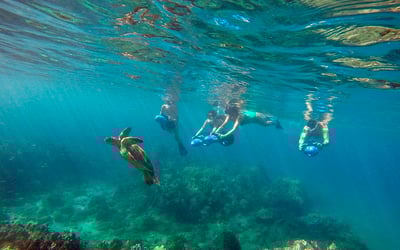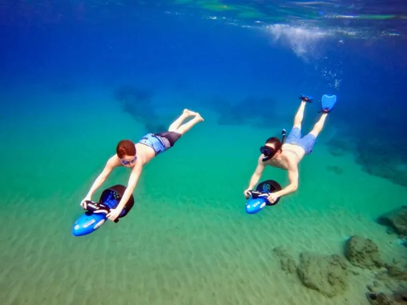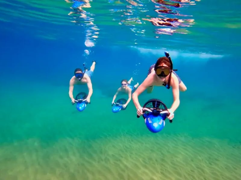 Glide over coral gardens with a sea scooter and spot turtles with patient, lifeguard-certified guides