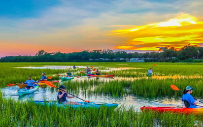 Glide through Cherry Grove’s winding tidal creeks as day fades to twilight. Reach a hidden beach for sunset views, then return beneath colorful lantern light while your guide shares insights on wildlife and marsh ecology.