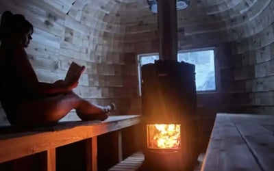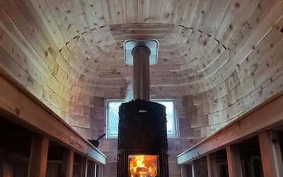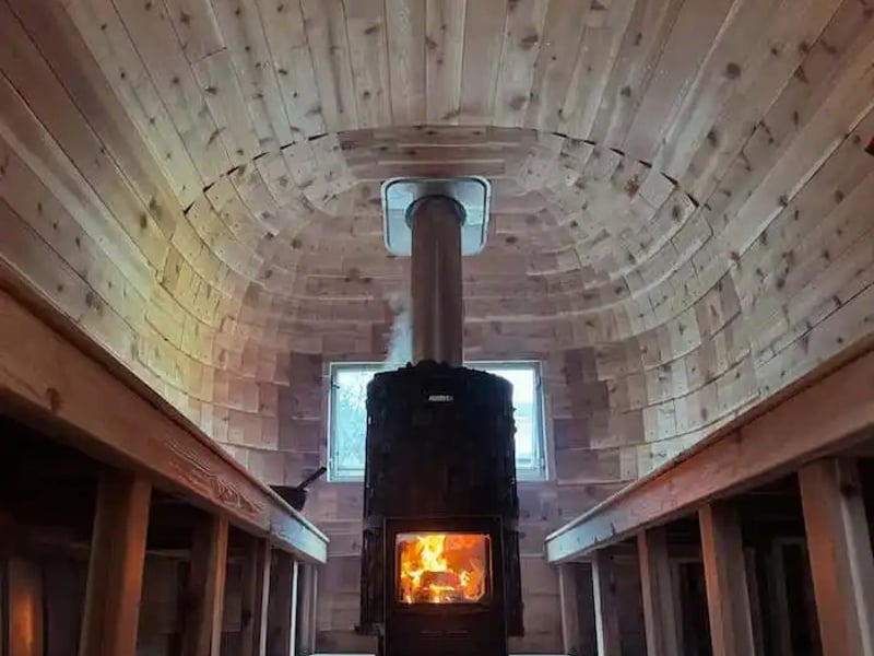 Relax in a beautifully renovated vintage Airstream converted into a wood-fired sauna. Enjoy a cozy changing area and a spa-like cedar room that heats quickly and seats 8–10.